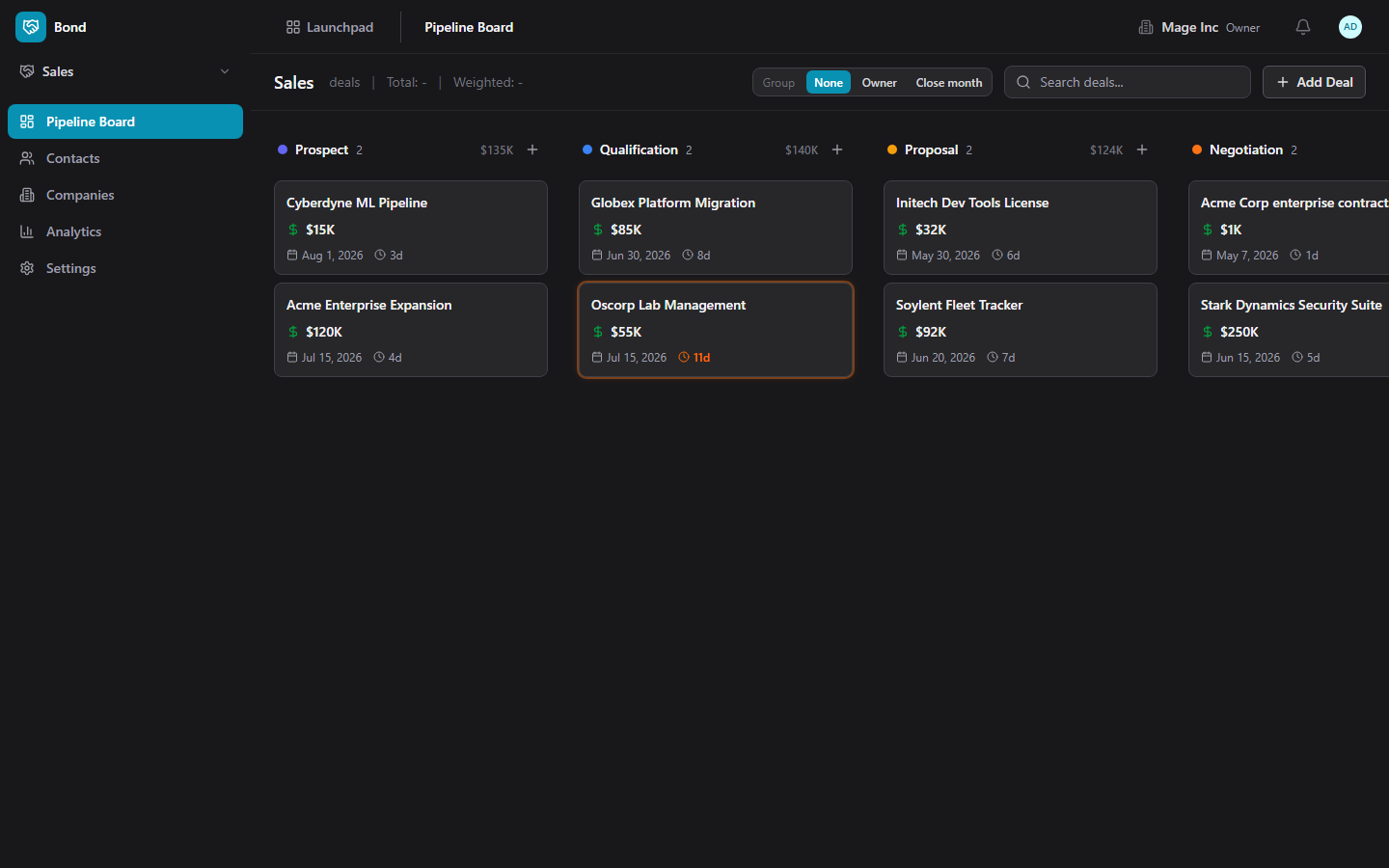 Most enterprise work software is sold as a collection of separate products that exchange data through APIs and integrations. BigBlueBam was designed as a single suite from day one. Any action taken in one application — a task created, a document edited, a customer contacted, an invoice sent — is immediately visible, searchable, and automatable from every other. A human or an AI agent working in any corner of the suite sees one coherent picture of the organization's work.